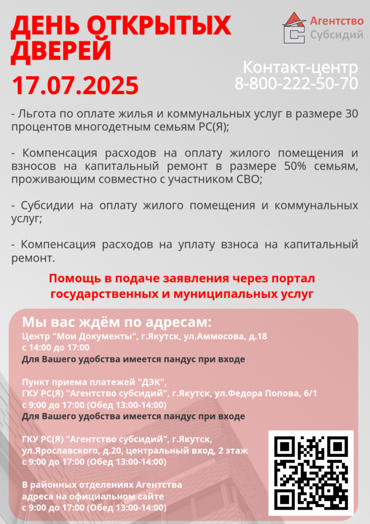 17 июля 2025 года ГКУ РС (Я) «Агентство субсидий» приглашает жителей республики на День открытых дверей, где специалисты Агентства проконсультируют по вопросам предоставления: