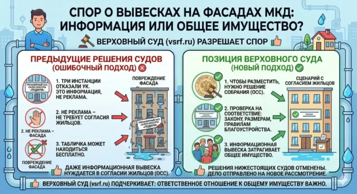 Однако, Верховный суд с таким подходом не согласился. Он указал, что да, с одной стороны закон о рекламе не применяется к обычным вывескам без рекламных призывов. Однако, это не означает, что их можно размещать «как угодно». В таких случаях суды обязаны проверять, соответствует ли вывеска требованиям закона в части обязательной информации о бизнесе, не выходит ли она за разумные размеры и соблюдены ли местные правила благоустройства. Фактически суд подчеркнул, что даже обычная вывеска с названием организации затрагивает общее имущество дома, а значит, вопрос нельзя рассматривать формально. В итоге, решения нижестоящих судов отменены, дело отправлено на новое рассмотрение.
