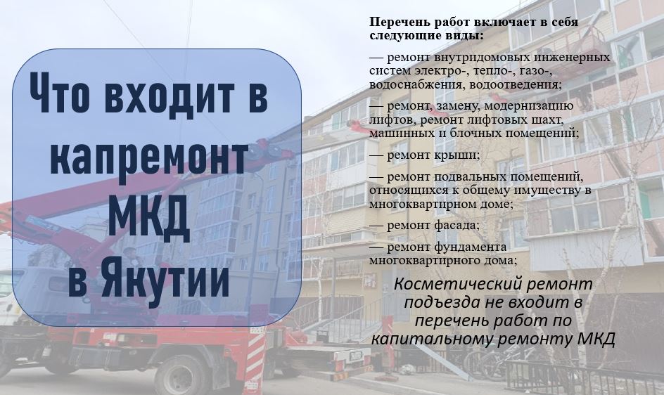 Фонд капремонта Якутии разъясняет, что согласно п. 1 ст. 166 ЖК РФ «Капитальный ремонт общего имущества в многоквартирном доме», перечень работ включает в себя следующие виды: ремонт внутридомовых инженерных систем электро-, тепло-, газо-, водоснабжения, водоотведения; ремонт, замену, модернизацию лифтов, ремонт лифтовых шахт, машинных и блочных помещений; ремонт крыши; ремонт подвальных помещений, относящихся к общему имуществу в многоквартирном доме; ремонт фасада; ремонт фундамента многоквартирного дома.