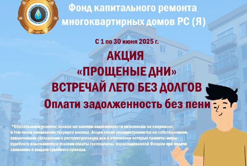 Фонд капремонта Якутии проводит акцию «Прощеные дни» с 1 по 30 июня 2025 года включительно. Обязательное условие: полное погашение всей задолженности по взносам на капремонт, а также текущего начисления месяца включительно одним платежом. Напоминаем, что сегодня, 30 июня 2025 года, акция завершается. — Отмечу, что не стоит специально выжидать акции, чтобы погасить задолженность без…