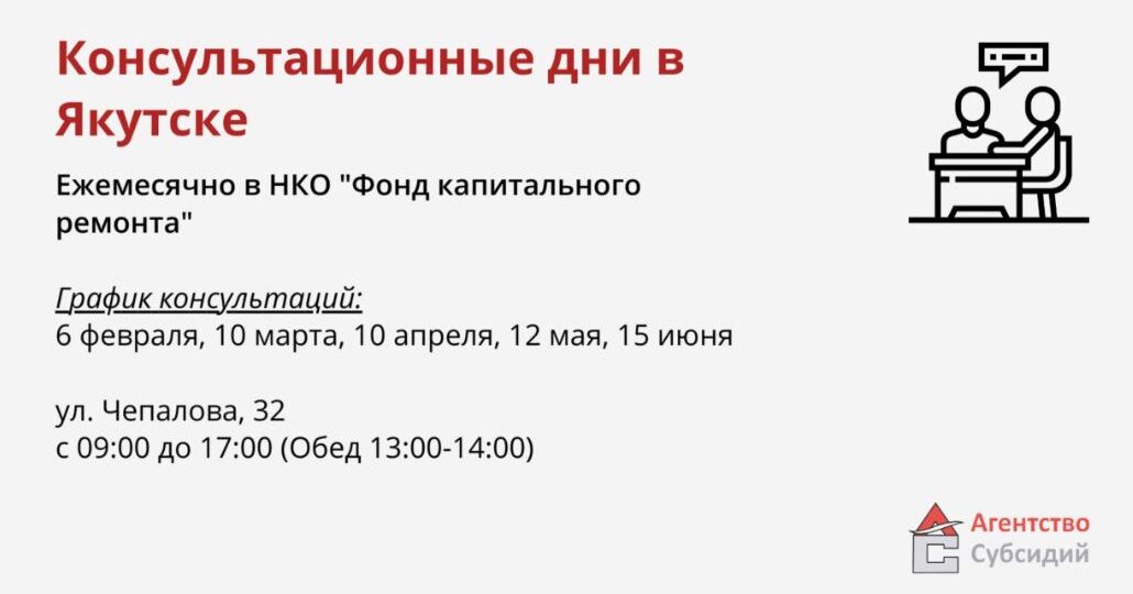 Ежемесячно Фонд капремонта Якутии совместно с ГКУ РС (Я) «Агентство субсидий» проводит акцию «Ваша льгота по капремонту».   Специалисты ГКУ РС (Я) «Агентство субсидий» проведут индивидуальные консультации по вопросам оформления компенсаций за уплаченные взносы на капитальный ремонт — для тех, кто имеет право на государственную поддержку.   Вы можете компенсировать часть затрат, если грамотно воспользуетесь…