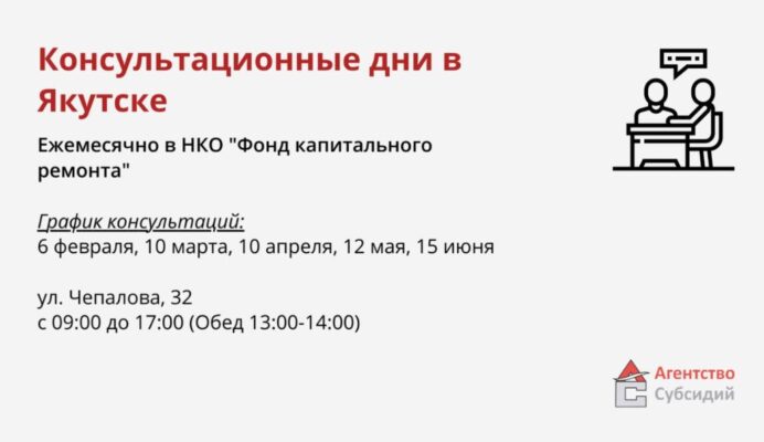 Специалисты ГКУ РС (Я) «Агентство субсидий» проведут индивидуальные консультации по вопросам оформления компенсаций за уплаченные взносы на капитальный ремонт — для тех, кто имеет право на государственную поддержку.