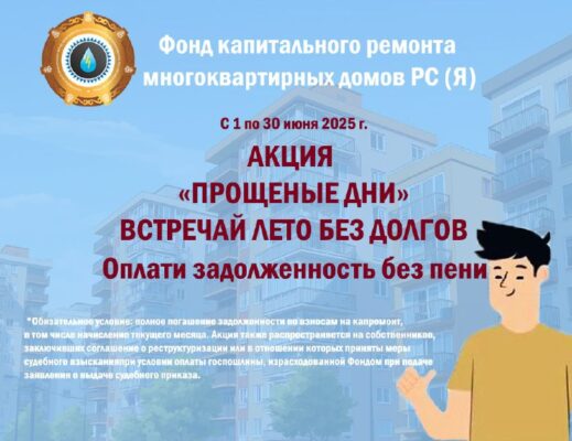 Фонд капремонта Якутии напоминает собственникам жилых и нежилых помещений многоквартирных домов об акции по оплате взносов без пени «Прощеные дни» до 30 июня 2025 года включительно.
