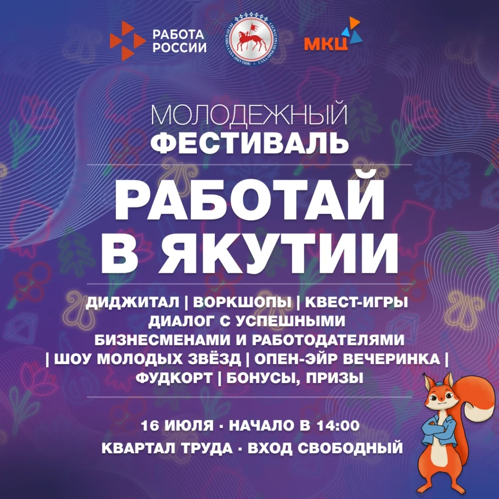 16 июля в Якутске состоится молодёжный фестиваль «Работай в Якутии!». Ведущие работодатели и образовательные организации Якутии соберутся в одном месте.